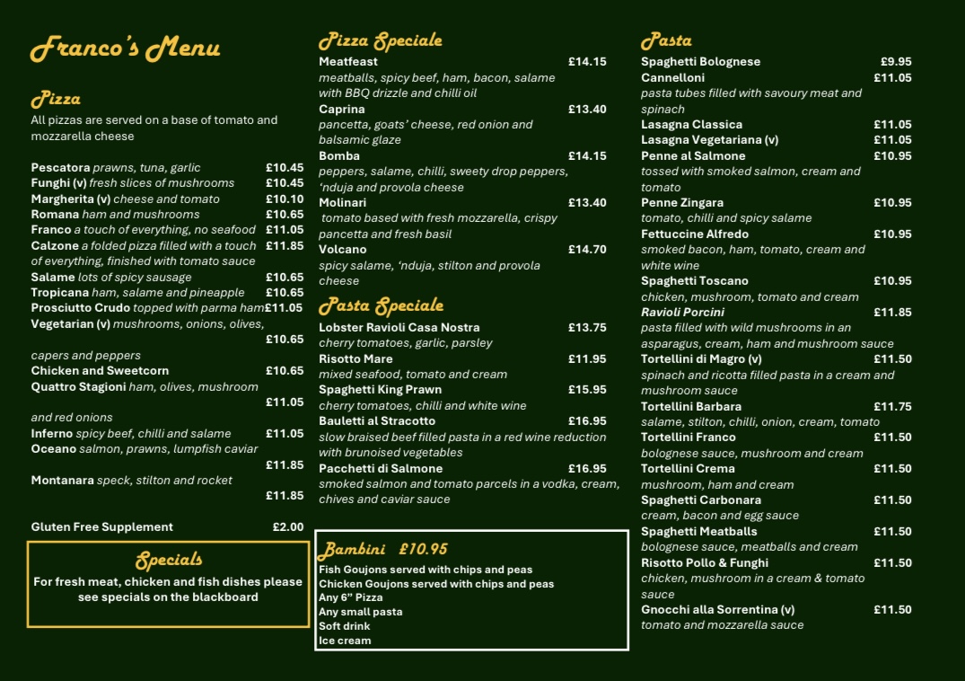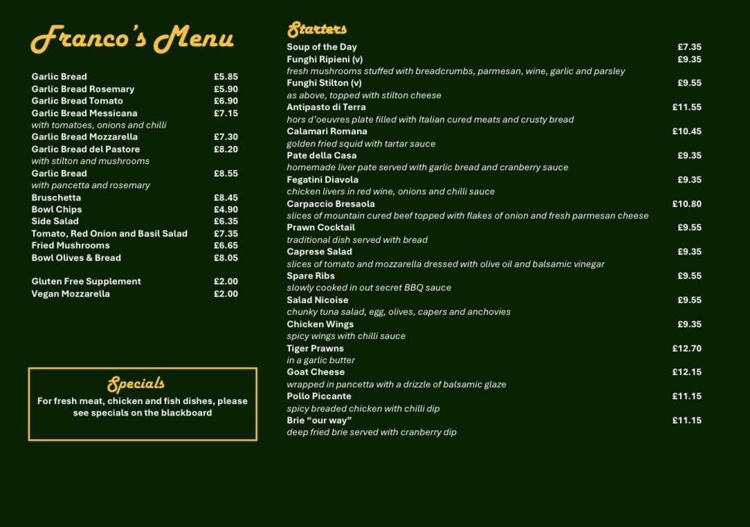 Francos Restaurant Menu
